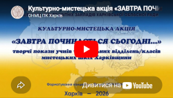 Попри дистанційний формат навчання, вихованці театральних відділень мистецьких шкіл Харківщини довели: сцена — це не лише підмостки, це стан душі. У форматі онлайн-концерту можна побачити глибокі театральні проєкти та яскраві творчі номери. Кожен виступ – це маніфест того, що майбутнє нашої культури ми створюємо вже зараз, незважаючи на відстані та обставини, що склалися.