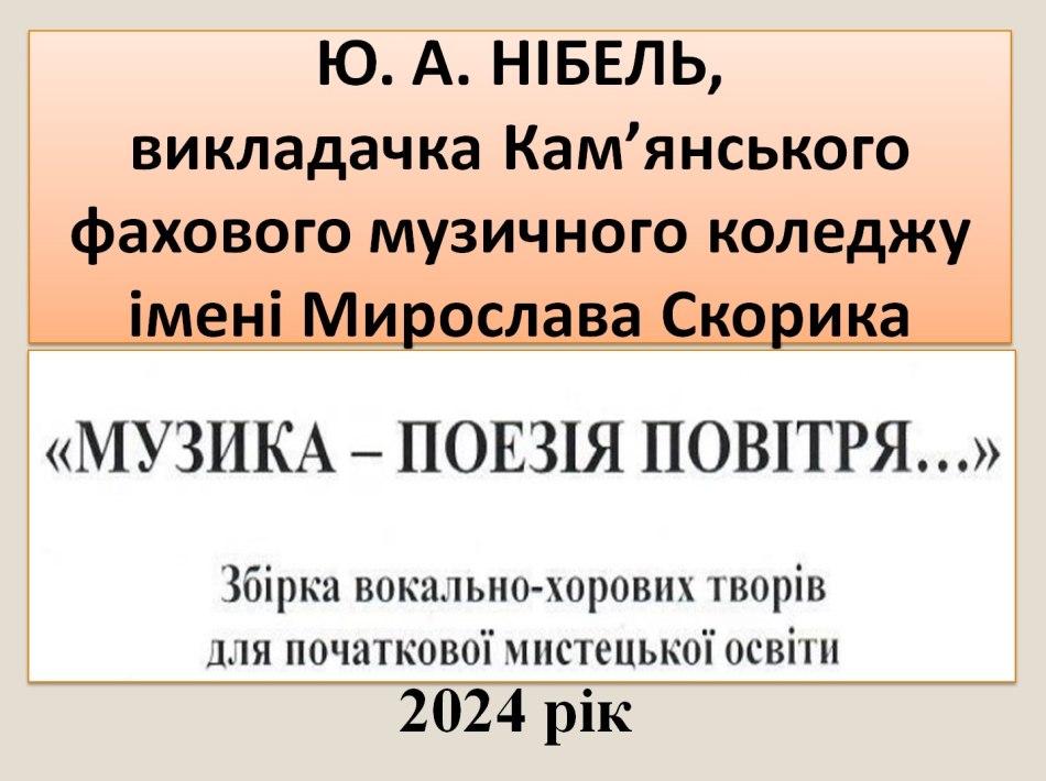 Жанна Борисевич розповіла про нову навчально-методичну літературу, розміщену у репозитарію ДНМЦЗКМО. Це збірка вокально-хорових творів для початкової мистецької освіти «Музика – поезія повітря». Її автор – Ю. А. Нібель, викладачка Комунального закладу «Кам’янський фаховий музичний коледж імені Мирослава Скорика» Дніпропетровської обласної ради. Збірка містить методичне пояснення, вокальні твори у супроводі фортепіано, вокально-хоровий цикл для дитячого хору «Так починаються дива…», пісні для молодшого дитячого хору тощо. Змістовний репертуар цієї збірки є актуальним і буде доступним для виконання учнями мистецьких шкіл (посилання на репозитарій: http://arts-library.com.ua/handle/123456789/1145).