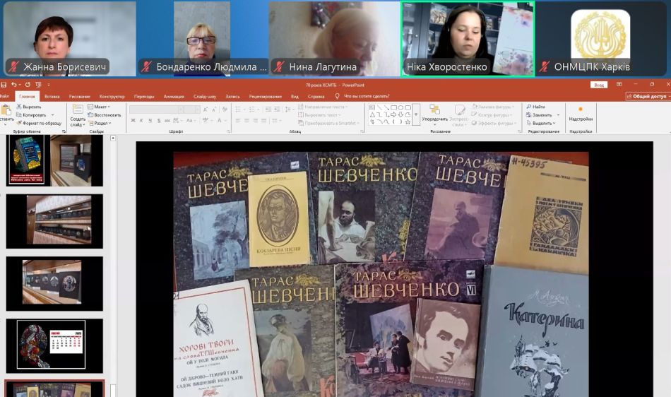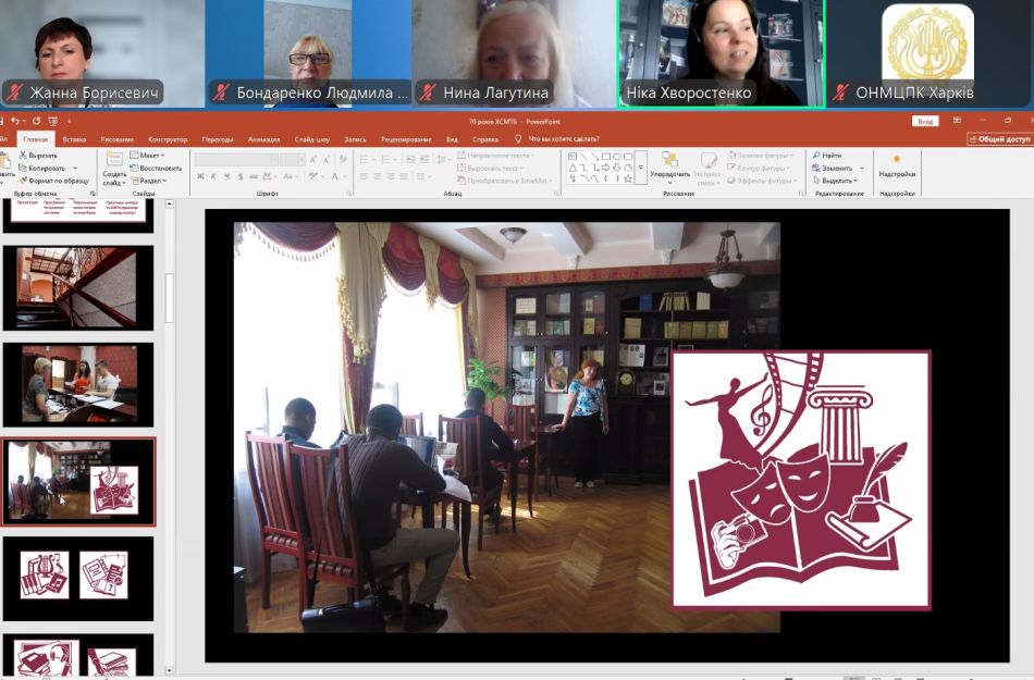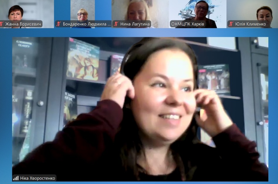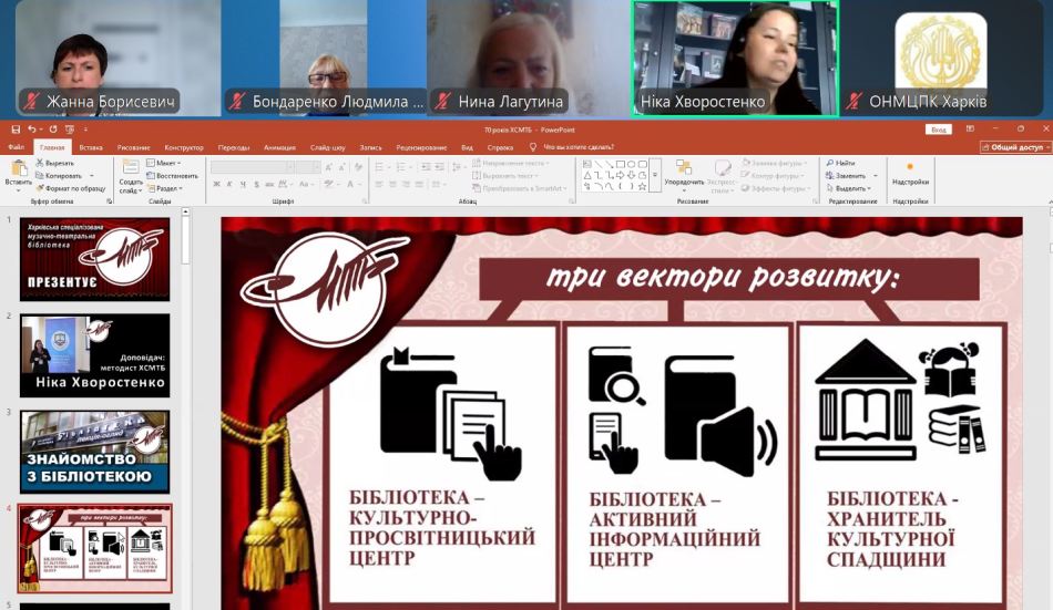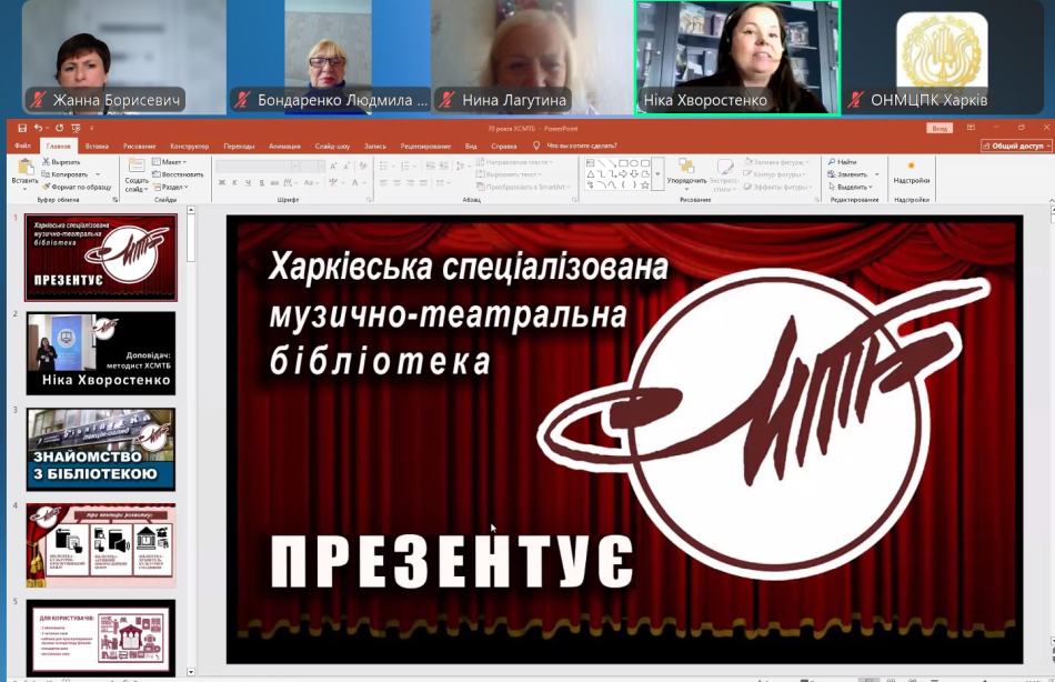 Методист Харківської спеціалізованої музично-театральної бібліотеки Ніка Хворостенко виступила перед викладачами мистецьких шкіл з доповіддю за темою: «Бібліотека – ваш помічник у світлі мистецтва: нові можливості та фонди». На цей час музично-театральна бібліотека має три вектори розвитку, а саме, вона є культурно-просвітницьким центром, активним інформаційним центром, хранителем культурної спадщини. Відвідувачі мають можливість користуватися 2 абонементами, 3 читальними залами, кабінками для прослуховування музики і перегляду фільмів. У бібліотеці працюють концертна і виставкова зали. Структура величезного бібліотечного фонду містить різноманітні книги й нотні видання, часописи, фонд газетних вирізок, грамплатівки та компакт-диски. Ніка Хворостенко розповіла про нові видання, призначені для викладачів хорового і сольного співу мистецьких шкіл. Яскрава, інформативно насичена презентація про роботу бібліотеки стала чудовим доповненням до зустрічі з викладачами.
