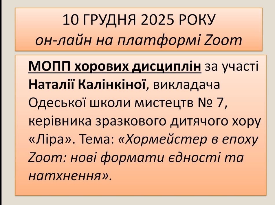 25 серпня 2025 року в режимі онлайн на платформі ZOOM відбувся обласний інструктивно-методичний семінар «Серпневий тиждень», котрий об’єднав спільноту викладачів хорових колективів і вокальних ансамблів мистецьких шкіл Харківщини.