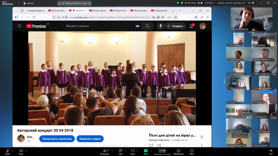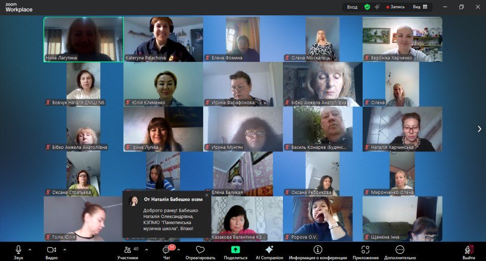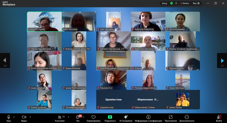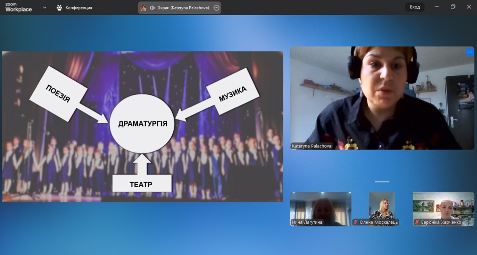 26 вересня 2025 року в режимі онлайн на платформі ZOOM викладачі класу сольного співу та вокально-хорових дисциплін мистецьких шкіл Харківщини зібралися на зустріч з Катериною ПАЛАЧОВОЮ, доктором філософії, старшим викладачем кафедри композиції та інструментування Харківського національного університету мистецтв ім. І.П.Котляревського, викладачем музично-теоретичних дисциплін та композиції ДМШ №12 ім. К.І. для знайомства з її новою авторською збіркою «Пісні для дітей на вірші українських поетів»..
