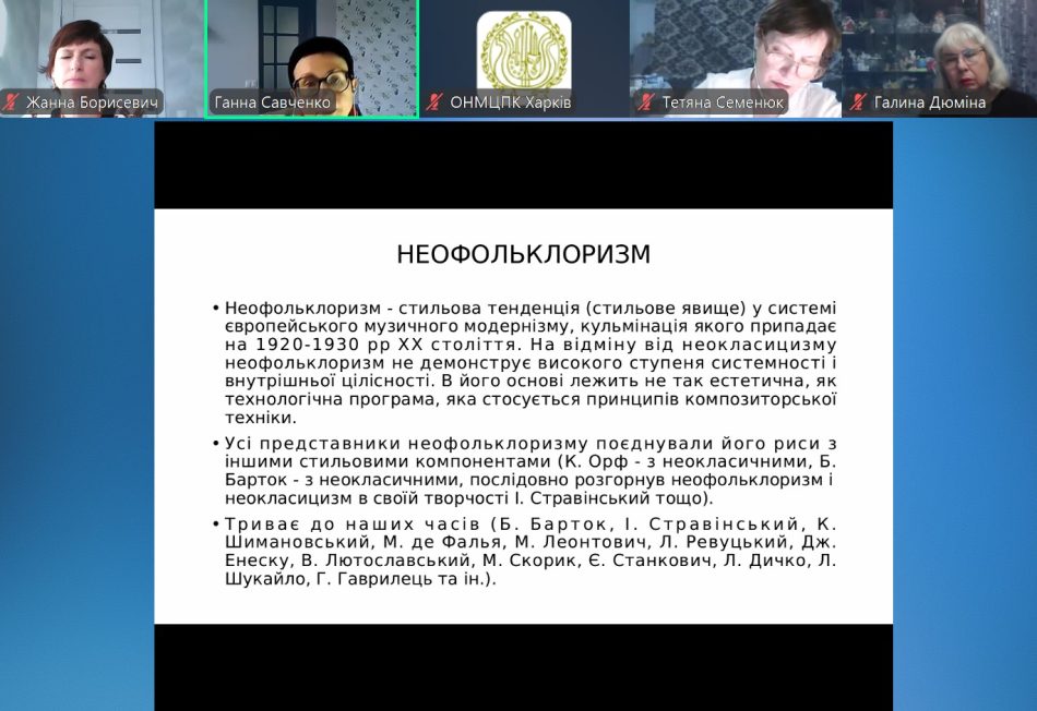 У період з 27 по 30 жовтня у форматі он-лайн,в режимі online на платформі Zoom проводились заняття з підвищення кваліфікації викладачів музично-теоретичних дисциплін і класу композиції мистецьких шкіл Харківської області за темою: «Методологічні засади та методичні рекомендації з вивчення музично-теоретичних дисциплін та композиції в сучасних умовах». .
