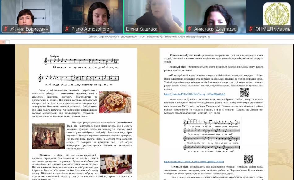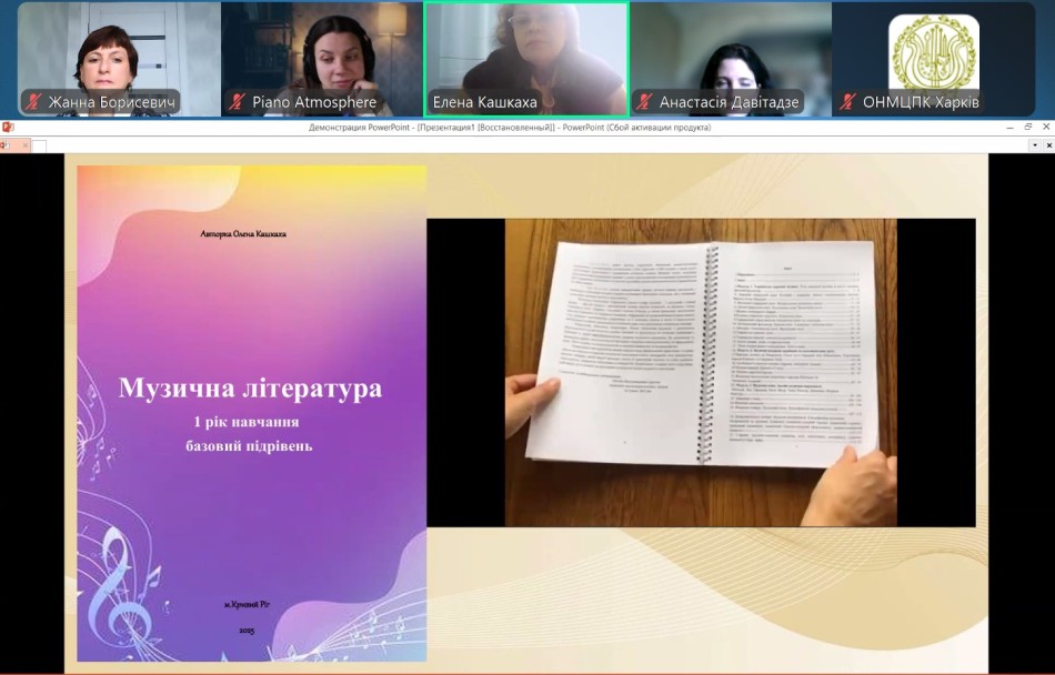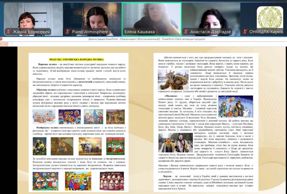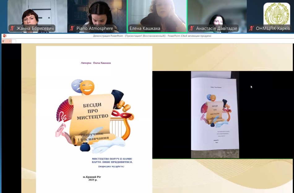 29 жовтня 2025 року в режимі онлайн на платформі ZOOM 29 жовтня 2025 року в режимі online на платформі Zoom було проведено обласне семінарське заняття для викладачів музично-теоретичних дисциплін мистецьких шкіл. Методист ОНМЦПК Жанна Борисевич анонсувала зустріч у грудні з Ренатою Сокачик, кандидатом мистецтвознавства, викладачем музично-теоретичних дисциплін Київської дитячої школи мистецтв ім. Стефана Турчака і розповіла про художні твори й книги українських видавництв, які можна використовувати в педагогічній роботі викладачів музичної літератури.