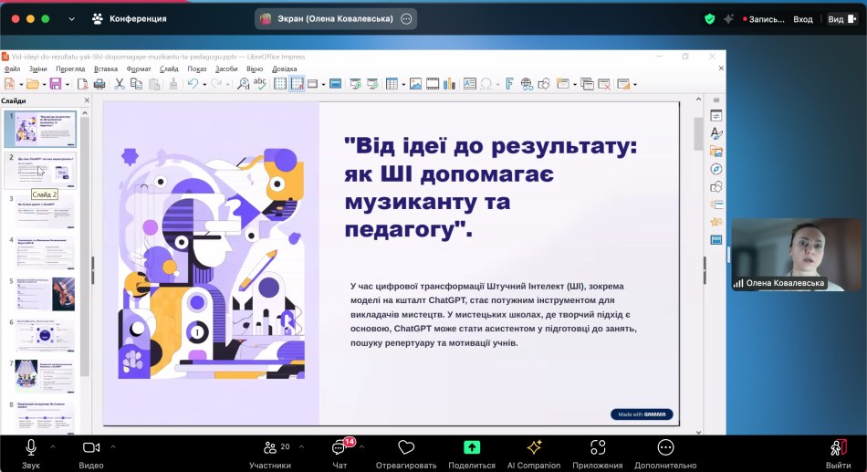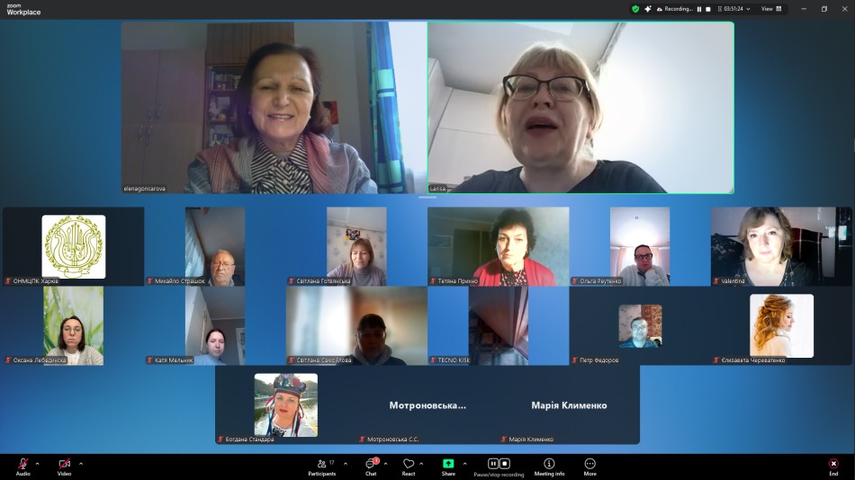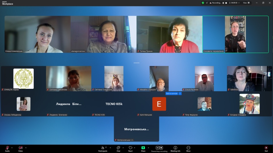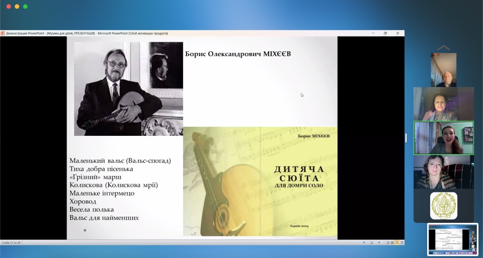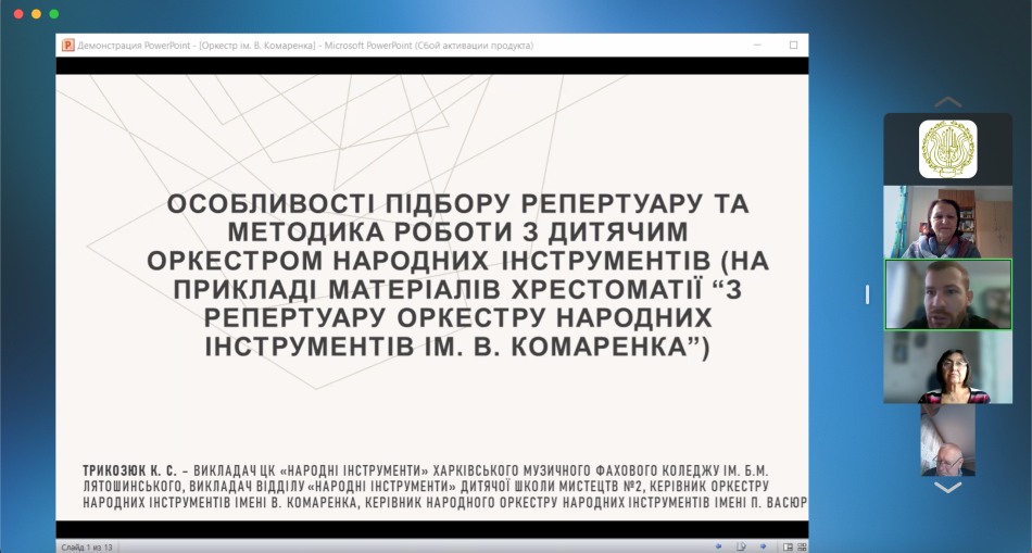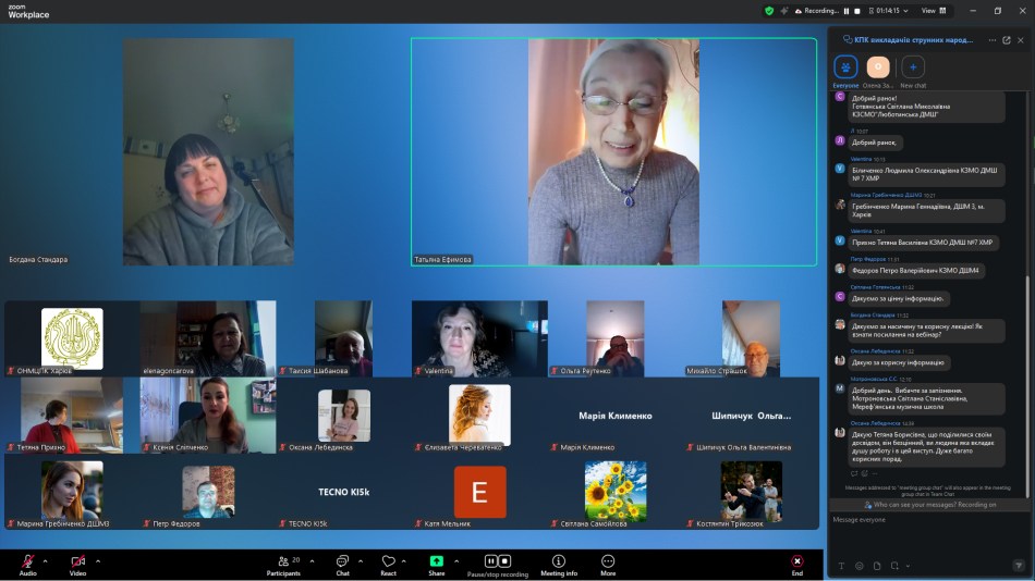 В онлайн режимі, на емоційному піднесенні, з різних міст області і міста Харкова, слухачі мали можливість оновити знання з нових досягнень мистецької педагогіки, ознайомитися з матеріалами фахових спрямувань: «Становлення домрової музики для дітей в доробку українських композиторів», «Орнаментика у виконавському арсеналі сучасного бандуриста», «Барокова музика у репертуарі цимбаліста: вибір творів, адаптація, виконавська технологія та інтерпретація», «Ансамблі малих форм. Особливості роботи в умовах сьогодення», з питаннями методичної роботи сучасного викладача мистецької школи: «Особливості підбору репертуару та методика роботи з дитячим оркестром народних інструментів /на прикладі матеріалів хрестоматії «З репертуару оркестру народних інструментів ім. В. Комаренка»/, «Тандем концертмейстера та педагога. Ключ до спільного успіху», «Від ідеї до результату: як ШІ допомагає музиканту та педагогу», з думкою та рекомендаціями психолога «Навчати з розумінням: вікові особливості як ключ до ефективної взаємодії», ознайомитися з деякими тенденціями сучасного педагогічного репертуару, особливостями сучасного ділового мовлення, взнати про правове регулювання діяльності закладів мистецької освіти в Україні тощо.