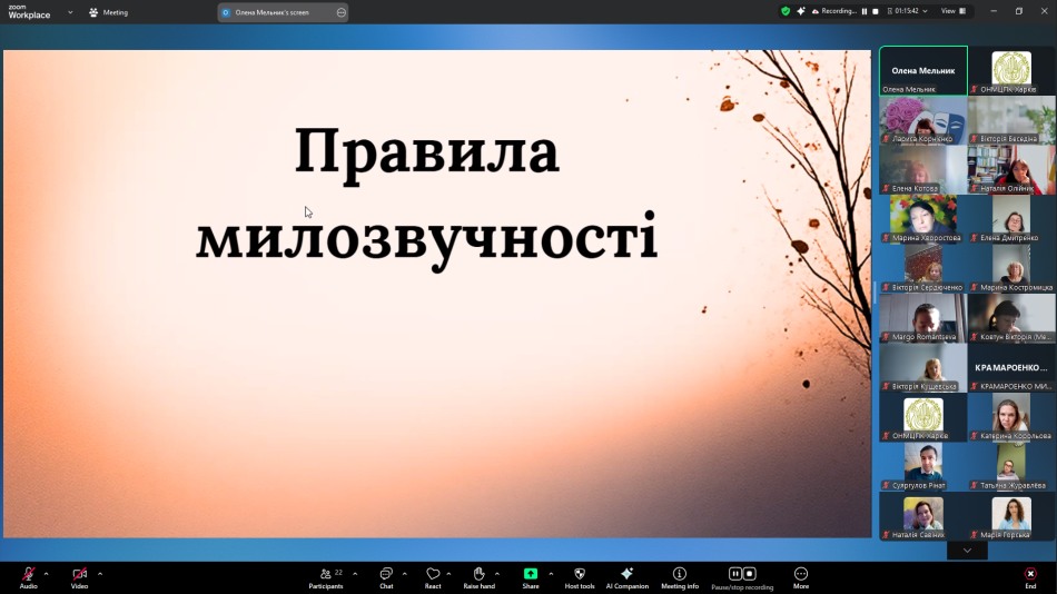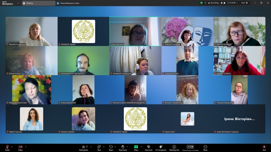 15 листопада 2025 року в режимі онлайн на платформі ZOOM відбулося заняття з удосконалення мовленнєвих компетентностей викладача театральних/телевізійних дисциплін мистецької школи. викладачів театральних/телевізійних класів/відділень мистецьких шкіл. Заняття проводила Олена Мельник, викладач-методист Харківського фахового вищого коледжу мистецтв.