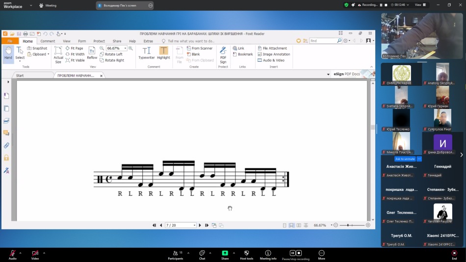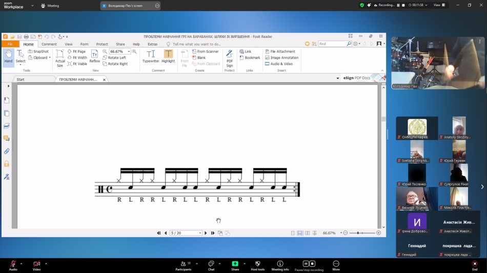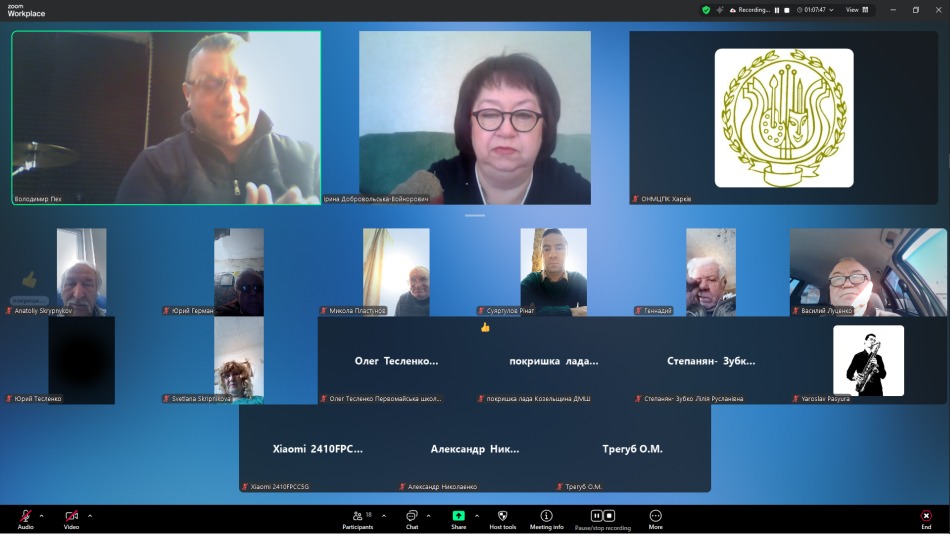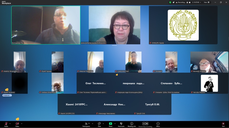 27 лютого 2026 року в режимі online на платформі ZOOM відбувся Семінар викладачів ударних та духових інструментів мистецьких шкіл за участі Володимира ПЕХА, старшого викладача вищої категорії Харківського національного університету мистецтв імені І.П. Котляревського за темою: «Проблеми та перспективи удосконалення методики навчання грі на ударній установці».