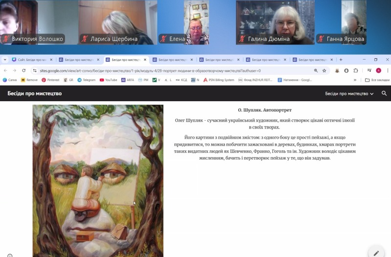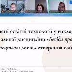 Ганна Кулага, викладач Височанської школи мистецтв виступила з доповіддю: «Сучасні освітні технології у викладанні навчальної дисципліни «Бесіди про мистецтво»: досвід створення сайту». Пані Ганна поділилася практичним досвідом використання навчального сайту як інструменту реалізації чинної програми дисципліни «Бесіди про мистецтво». Особливу увагу приділила поєднанню традиційної форми роботи із сучасними цифровими можливостями.