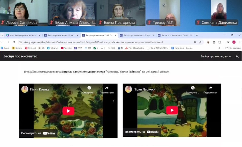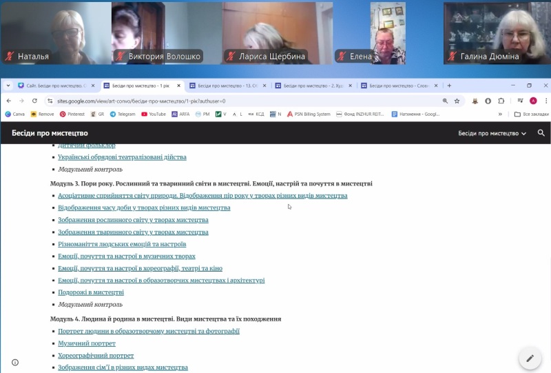 На семінарі розглянуто структуру сайту, принципи його побудови відповідно до модульної системи навчання, а також особливості наповнення матеріалів для першого та другого років навчання. Окремо висвітлено питання розвитку асоціативно-образного мислення учнів, формування словникового запасу для опису мистецьких вражень, а також використання візуальних, аудіо- та інтерактивних матеріалів під час уроку. В межах доповіді продемонстровано приклади використання сайту на різних етапах навчання: від роботи з художнім образом у першому році до систематизації знань і підготовки до підсумкового іспиту в другому році. Підкреслено, що навчальний сайт не замінює живу бесіду, а виступає як допоміжний інструмент, який підтримує діалог, структурує матеріал і підвищує зацікавленість учнів.