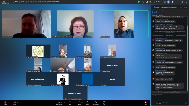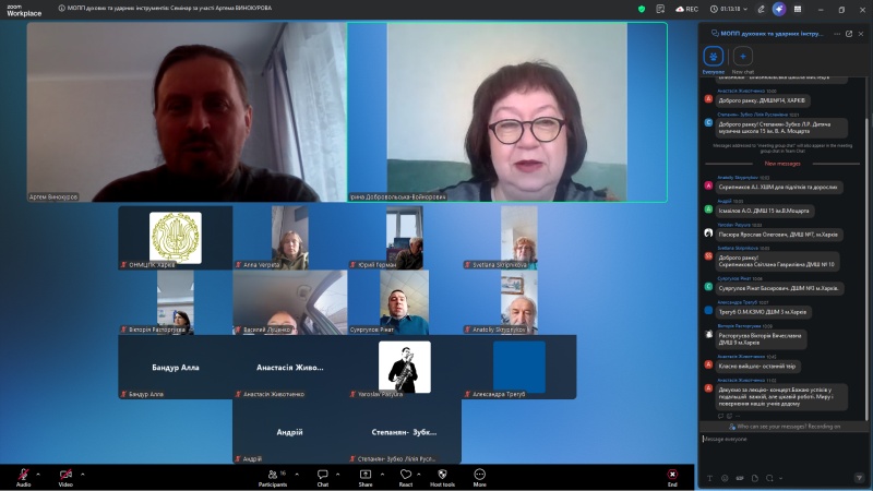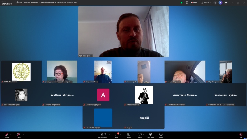 18 квітня 2026 року в режимі онлайн на платформі ZOOM відбувся семінар за участі Артема ВИНОКУРОВА, викладача-методиста вищої категорії Харківського музичного фахового коледжу імені Б.Лятошинського на тему: «10 років у ритмі джазу. Методичні поради до роботи з дитячим духовим оркестром».