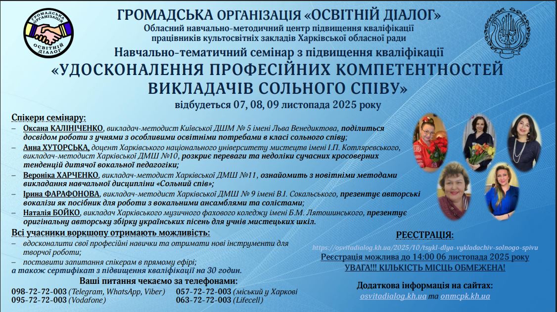 26 жовтня поточного року в приміщенні дитячої музичної школи №3 ім. М. Кармінського розпочався цикл семінарських занять для викладачів класу сольного співу шкіл естетичного виховання Харківської області та м. Харкова. Читати далі →