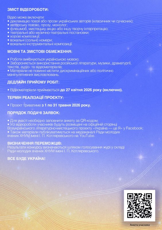Усі відео учасників будуть розміщені на офіційній сторінці Всеукраїнського літературно-мистецького проєкту “Україна – це Я” у Facebook та на медіа-каналі Ради молодих вчених ХНУМ імені І.П. Котляревського в YouTube.