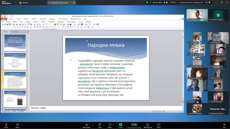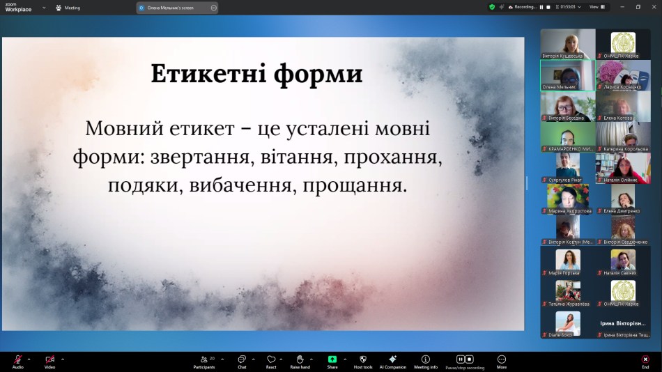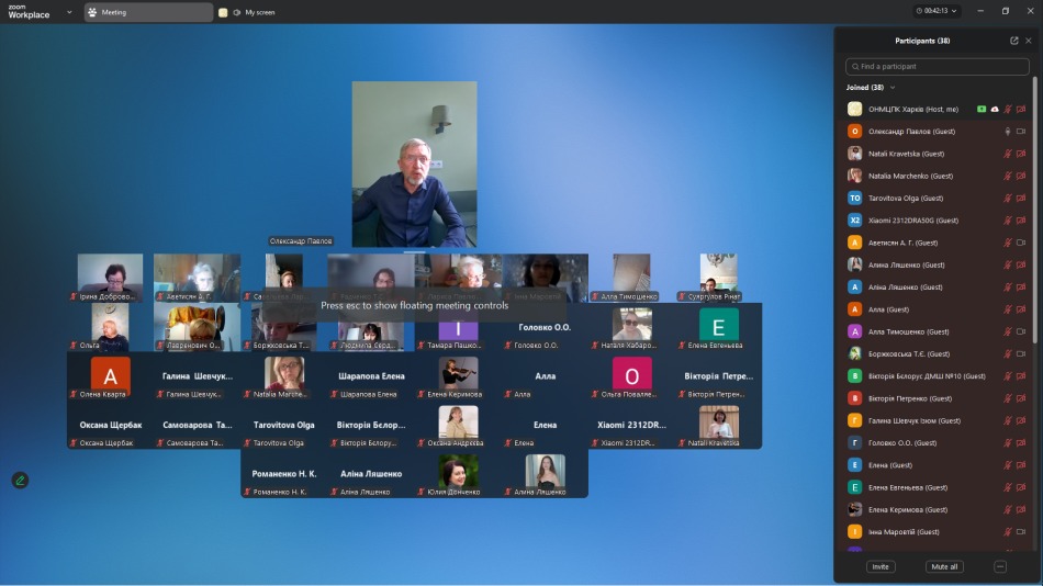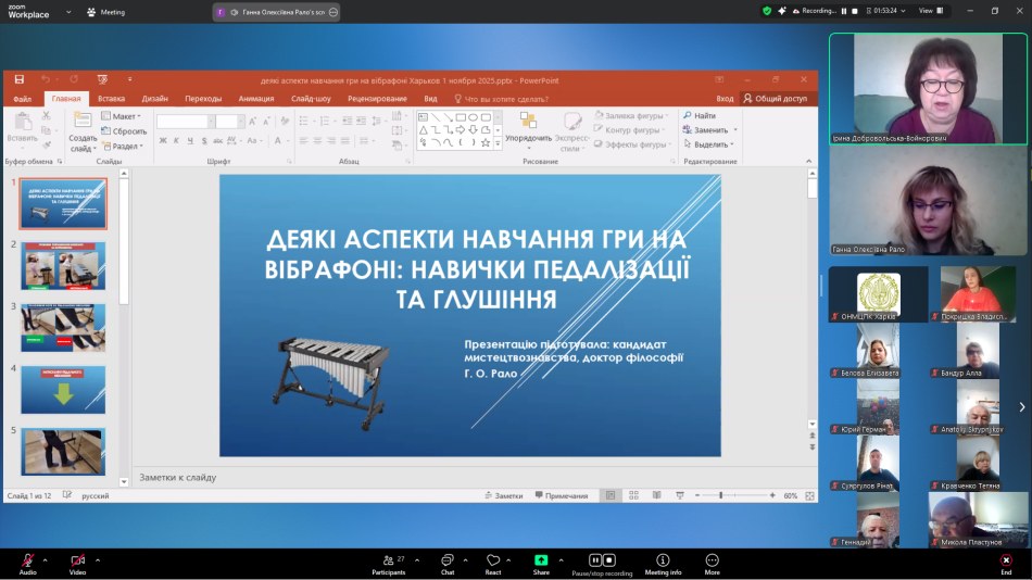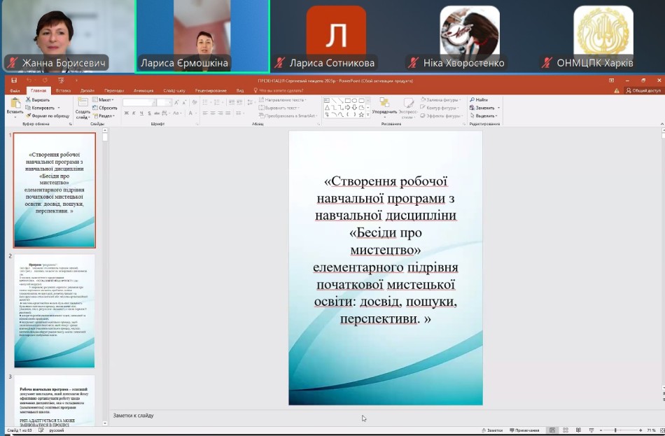 15 листопада 2025 року в режимі онлайн на платформі ZOOM відбулося заняття з удосконалення мовленнєвих компетентностей викладача театральних/телевізійних дисциплін мистецької школи. викладачів театральних/телевізійних класів/відділень мистецьких шкіл. Заняття проводила Олена Мельник, викладач-методист Харківського фахового вищого коледжу мистецтв.